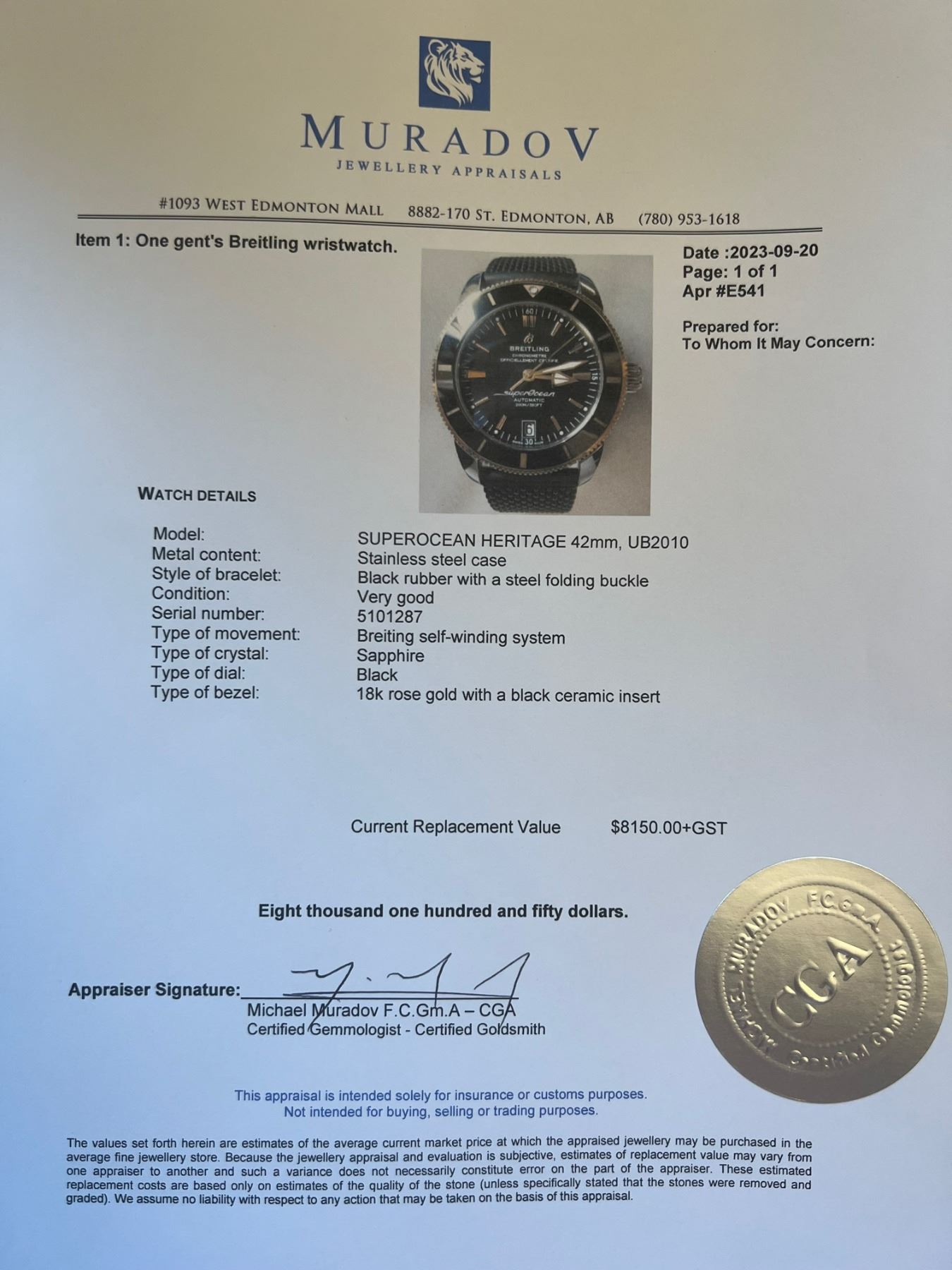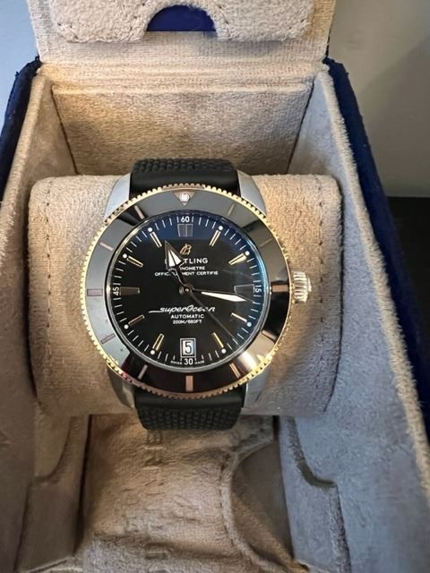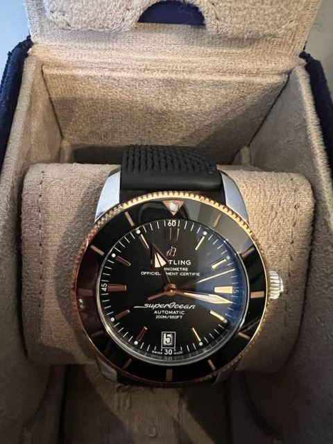 The Breitling Superocean Heritage 42mm Automatic UB2010 watch is perfect for watch enthusiasts who appreciate quality and functionality. Its 42 mm stainless steel case is complemented by an 18K red gold unidirectional rotating bezel with a black ceramic ring, giving the watch a sophisticated look. The black dial features red gold tone hour indexes and luminescent markers for easy readability, while the red gold tone luminous triangular hour hands enhance the overall look of the watch. The watch performs functions including hours, minutes, seconds, and date, making it great for everyday wear. It is powered by a self-winding mechanical movement, the Calibre Breitling B20 (Manufacture), with 26 jewels oscillating at 28,800 v.p.h, ensuring accurate timekeeping. The watch has a power reserve of approximately 70 hours, making it practical for everyday use. The front side is protected by sapphire crystal, offering scratch-resistance, while the solid case back adds to the watch's durability. The watch is water-resistant up to 200 meters, ensuring that it is suitable for swimming and snorkeling. The black rubber strap with steel push button folding buckle enhances the overall look and durability of the watch. The watch is unique and can be the perfect addition to any watch enthusiast's collection.